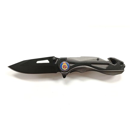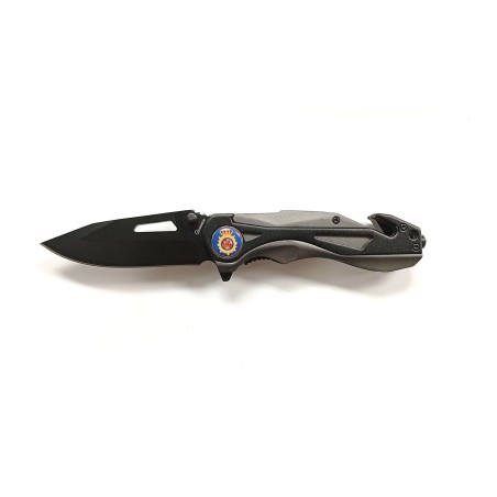 Navaja táctica de goma aluminio/negro con emblema de la Policia Nacional.