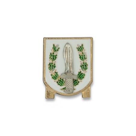 Escudo español cuadrilongo, semicircular, con un borde dorado de 1 milímetro. En su interior y sobre esmalte blanco, machete español de plata con la hoja bruñida y la empuñadura oxidada, enmarcado por las dos ramas de roble que cruzan sus tallos por debajo de la empuñadura, en la parte inferior y quedan abiertas en la superior. Los nervios de las hojas, ribetes de las mismas y bellotas en oro y el resto de la hoja en su color natural.